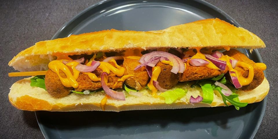 Stokbrood met een assorti-stick, sla, andalousesaus en rode ui. Kom lekker proeven!