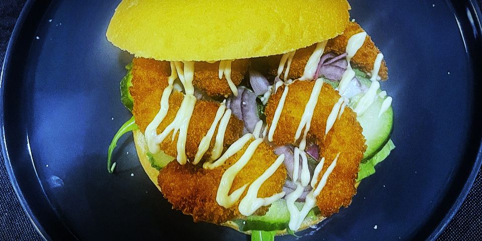 Krokante bol met gefrituurde garnalen, sla, komkommer, rode ui en citroen-mayonaise. Kom lekker proeven!