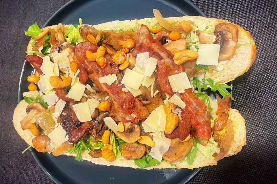 Stokbrood met sla, kruidencreme, truffelmayo, gebakken champignons en uien, parmezaanse kaas, notenmix en bacon. Kom lekker proeven!