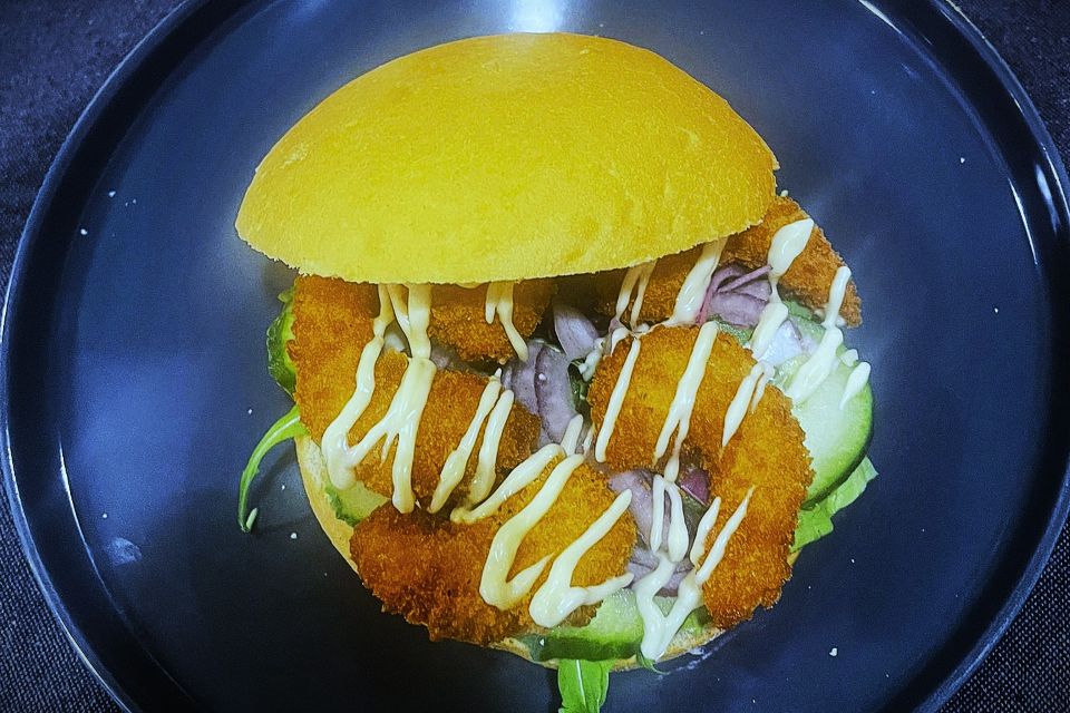 Krokante bol met gefrituurde garnalen, sla, komkommer, rode ui en citroen-mayonaise. Kom lekker proeven!